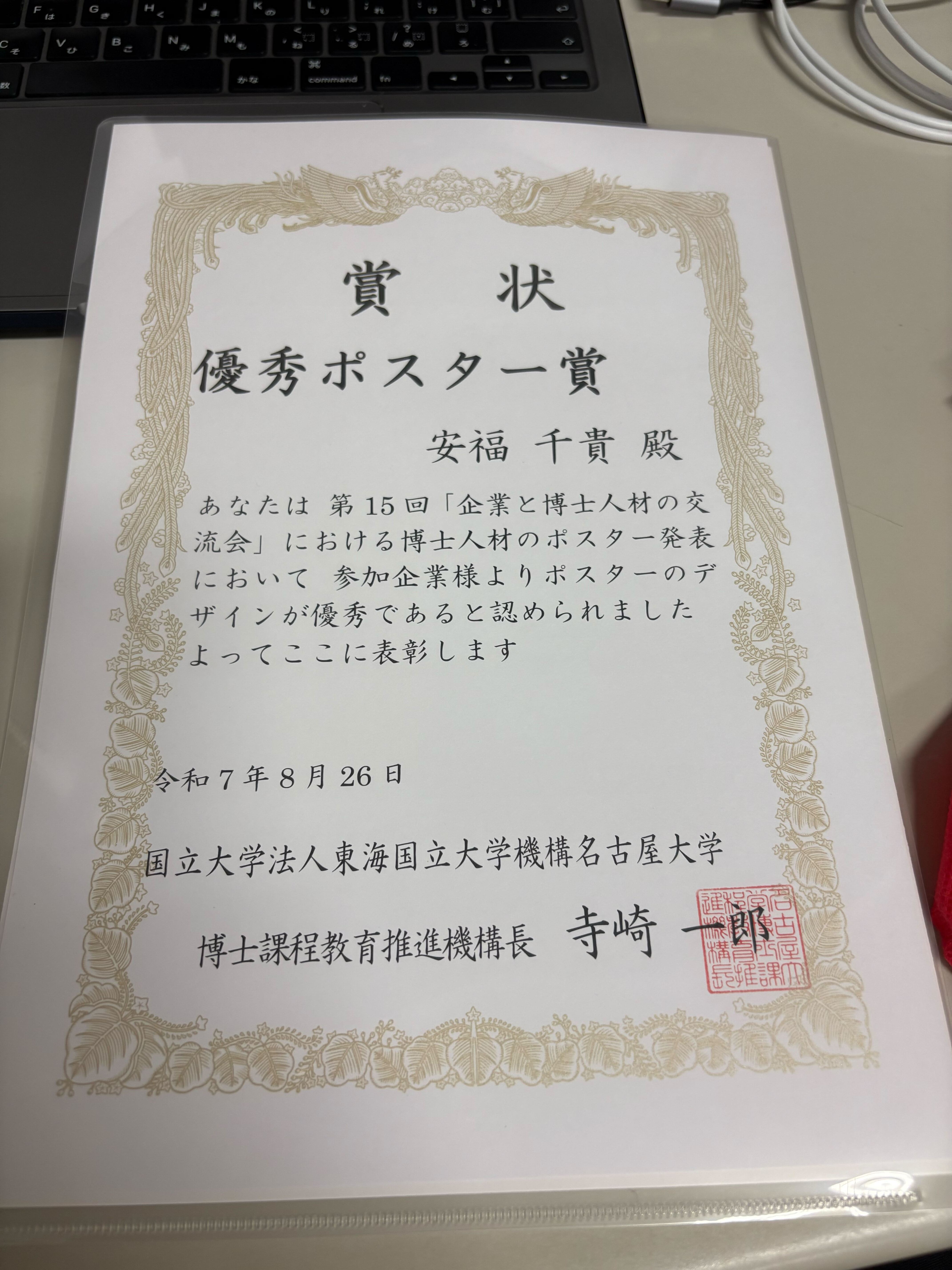 - D2の安福君が8/26に開かれた名古屋大学の第15回「企業と博士人材の交流会」のおけるポスター発表において、参加企業様よりポスターのデザインが優秀であるとして優秀ポスター賞を受賞しました。おめでとうございます。